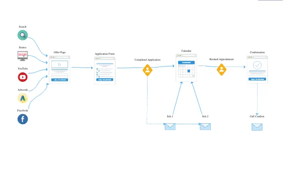 This process involves a two step process to capture the essential info before directing your customers to a loooong application they're not ready to fill out. Priming and nurturing via video, email follow-ups and more ensure that more of your visitors and prospects convert into paying customers.